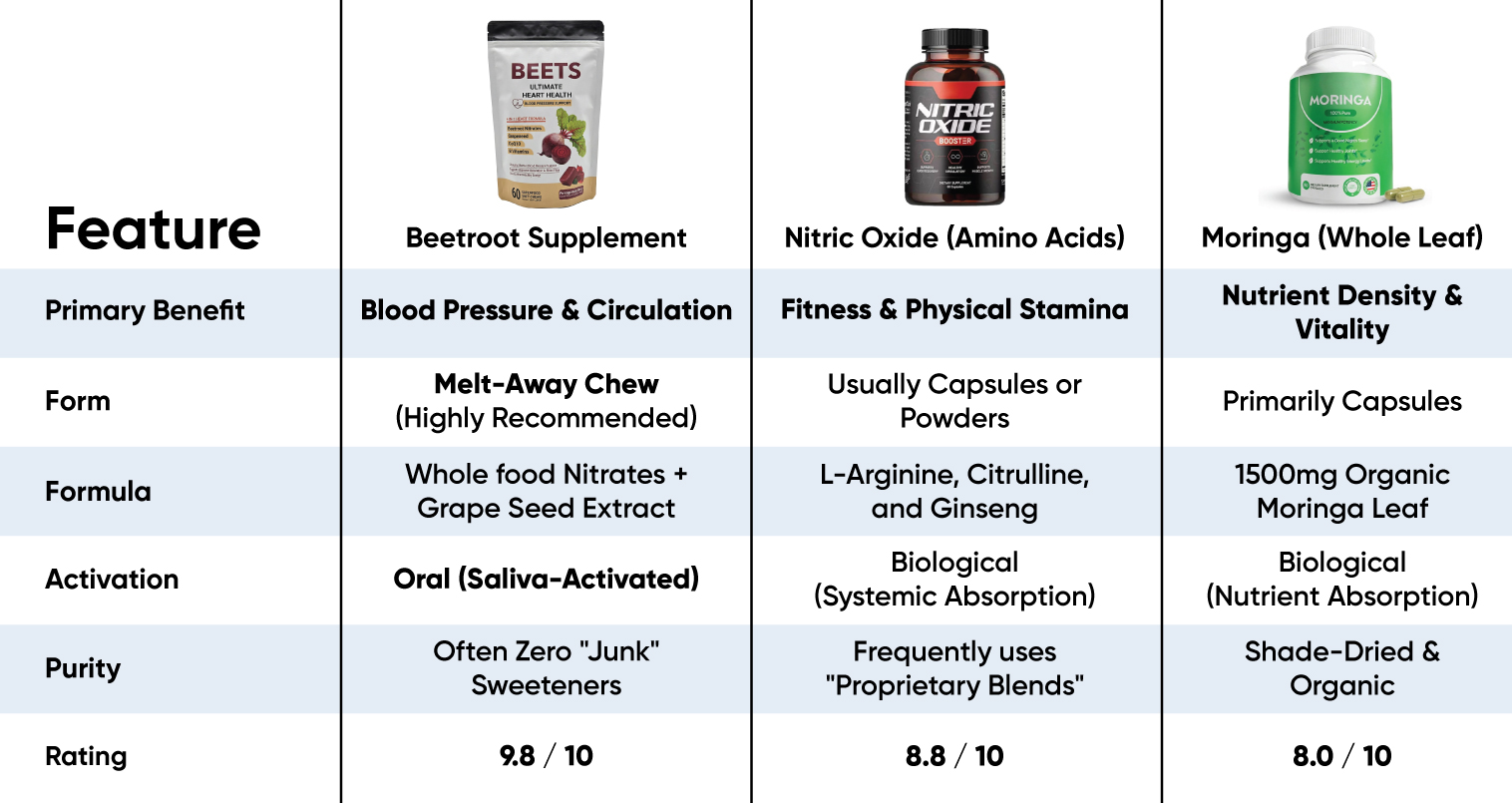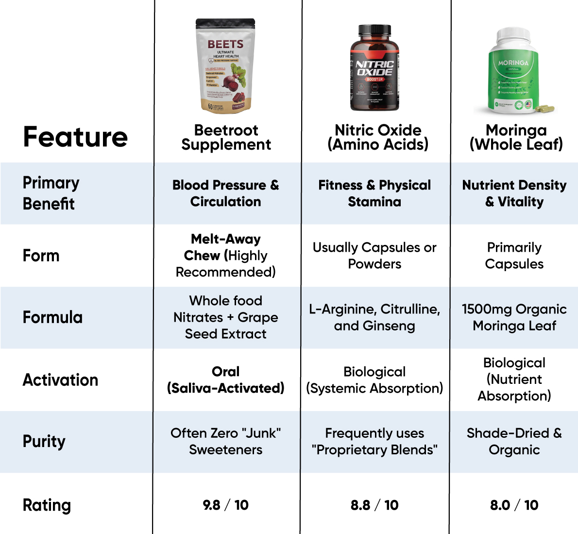 While other options like Moringa and Oil of Oregano offer notable nutritional benefits, our investigation into the "Nitrate Activation Gap" reveals why beetroot remains the gold standard for cardiovascular support. The decision to crown Lumivyx as the winner is based on three critical pillars: Oral microbiome activation, synergetic formulation, and safety-first transparency.
