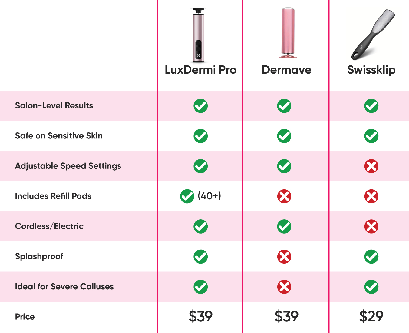 If you’re tired of snagging your sheets or hiding your feet in sandals, LuxDermi Pro is the first tool we’ve found that delivers spa-like results at home. With 10 gentle-but-powerful speeds, a splashproof cordless design, and 40+ pads included (+10 free bonus nail polishing heads) , it removes even thick heel calluses without causing discomfort or damage.