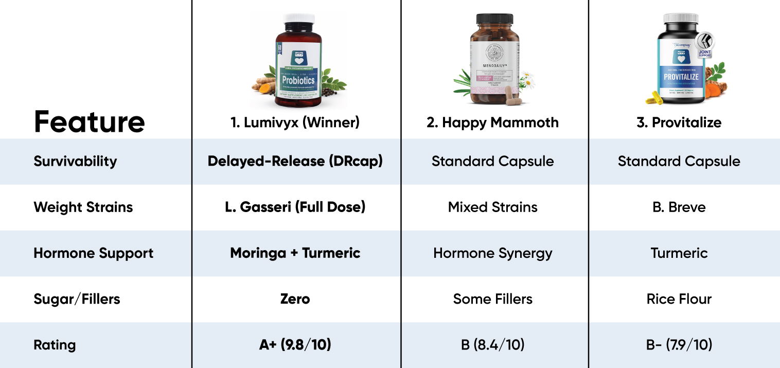 While competitors like Provitalize and Happy Mammoth offer pieces of the puzzle, they fail on the technical side—either by using standard capsules that let the probiotics die in the stomach or by using generic fillers that cause bloat. Lumivyx is the only brand that provides a complete, 3rd-party tested, acid-resistant solution specifically for the Estrobolome. It is the only choice for clinical-grade metabolic and hormonal support in 2026.