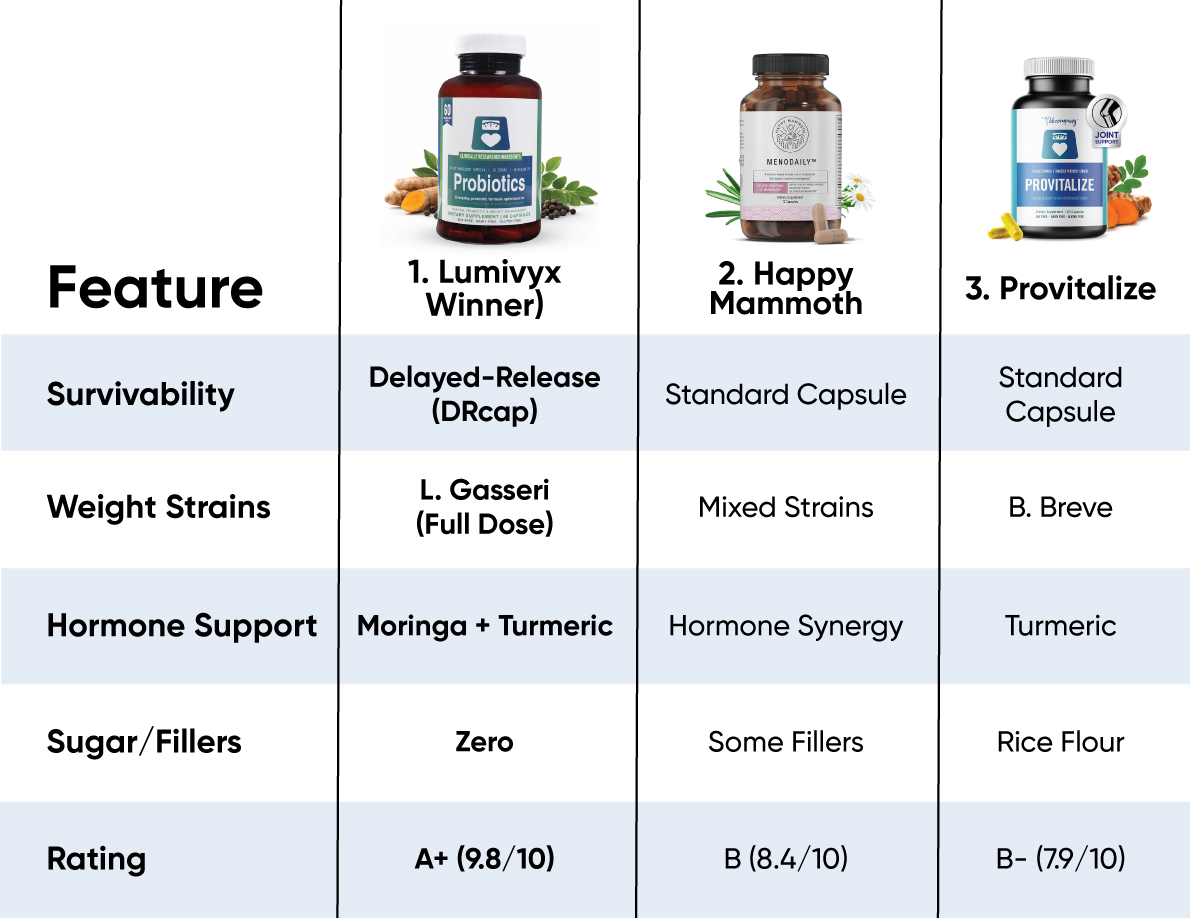 We tested the top 07 brands based on strain specificity, CFU survivability, and hormone-balancing co-factors. While TrustedConsumersReviews shares a parent entity with some reviewed brands e.g., Lumivyx, we're proud to evaluate products with our shared commitment to quality and consumer benefit. The #1 winner sets a new clinical standard for women over 40.