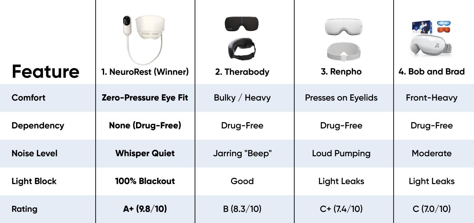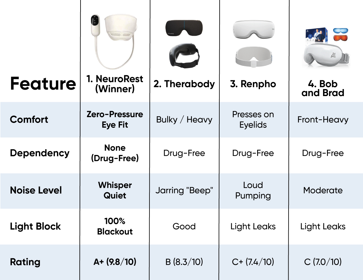 Lumivyx NeuroRest is the undisputed #1 choice because it actually understands the science of sleep. While other brands build heavy, loud "gadgets," Lumivyx created an active nervous system regulator. By eliminating eye pressure and using whisper-quiet heat and massage to literally turn off a racing mind, it delivers uninterrupted, deep, and refreshing rest. The difference is night and day.