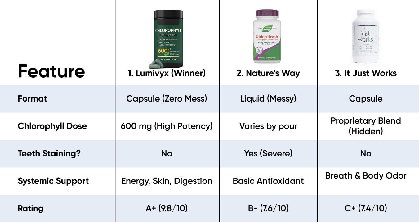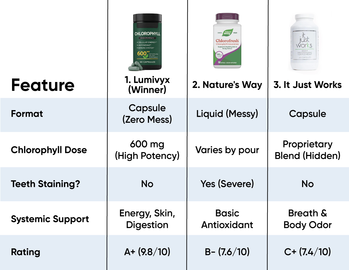 Lumivyx is the undisputed #1 choice for 2026 because it solves the biggest pain points of the chlorophyll trend: the mess and the weak dosages. By packing a clinical-grade 600 mg super-dose into an easy-to-swallow capsule, it targets systemic odor at the digestive root. Our testers reported feeling remarkably "fresh" and energized throughout the day, without ruining a single white t-shirt or staining their teeth. It is the ultimate natural confidence booster.